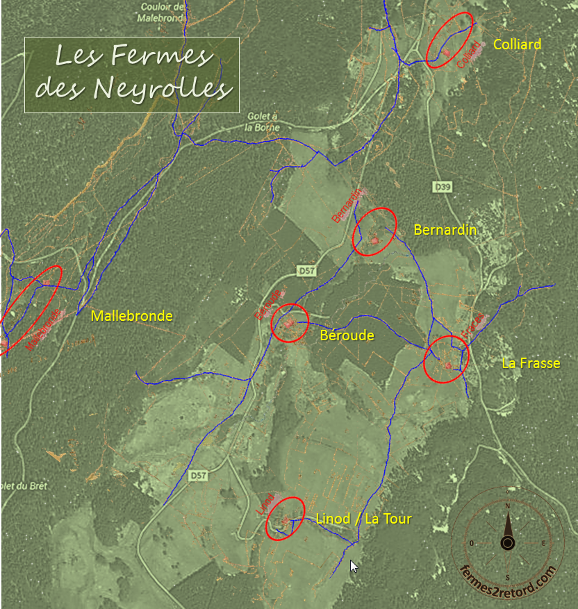Les restes des deux fermes de la Béroude (prononcer "B'roude") se situent (voir cadastre), après Colliard, au nord de la combe de Léchaud. Le deuxième bâtiment formant le domaine, s'appellait la Grange Bernardin.
