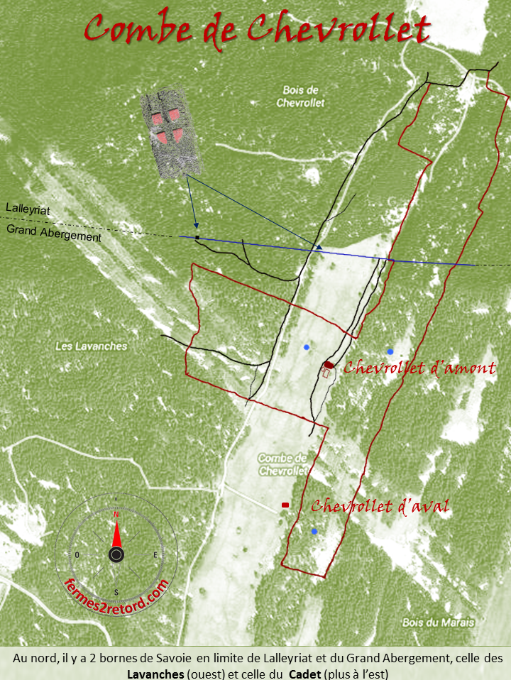 Sur cette carte de Chevrollet, on visualise bien (en rouge) l'emprise de cette propriété de 53 hectares à cheval sur les deux communes de Lalleyriat et du Grand Abergement La partie du Grand Abergement représentant plus de 36 hectares a été acquise à Monsieur Jean Marie BONNEVILLE, marchand de fromages aux Bouchoux. L'autre partie, située sur la commune de Lalleyriat, représentant plus de 16 hectares a été cédée par François Marie PERRET de Lalleyriat.