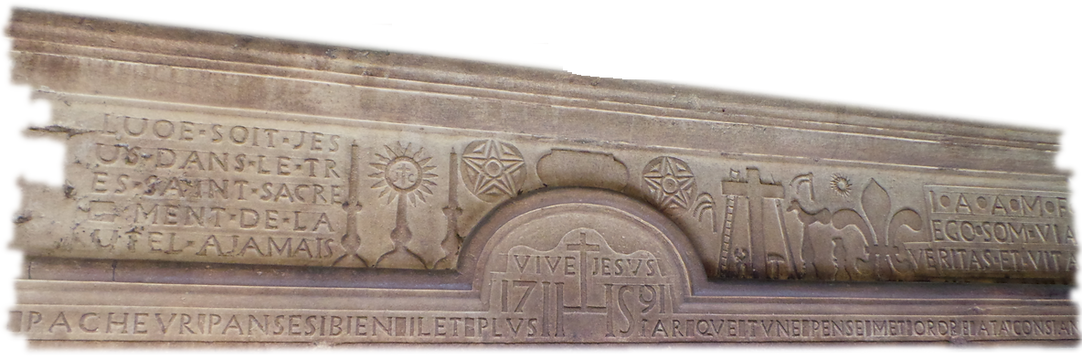 Dans cette période troublée, le manteau de la cheminée est un acte de foi complet, le premier cartouche en haut à gauche est lisible: